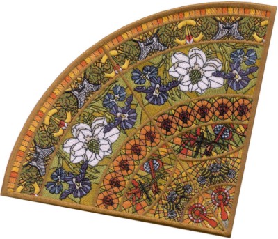 This applique design of stain glass used applique to reduce the overall stitch count by 50,000 stitches. More importantly it introduced an orange color throughout the design that when mixed with different densities of thread created many more shades and tones than thread colors that were actually used. The same green mixed with more thread and less applique creates a different color than when there is less thread and more fabric. This design is extremely striking to the eye, but rarely does the observer realize applique was used in the design.